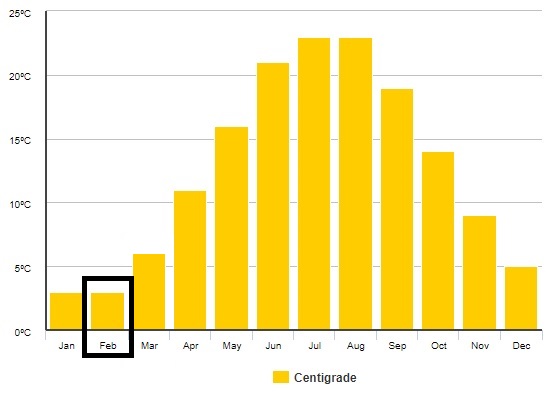 I přesto je únor teplotními průměry o jeden stupeň teplejší než předchozí leden a jedná se tak o první měsíc, kdy teploty pozvolna začínají stoupat až do červencových maximálních teplot.