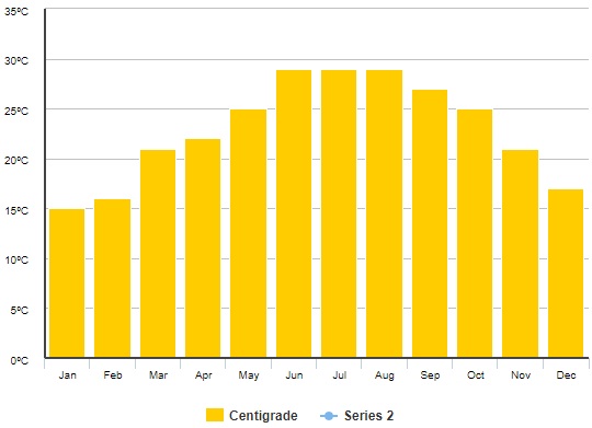 Za památkami se raději vydejte mimo letní období. To jsou teploty ještě snesitelné, i když pro někoho mohou být i tak nepříjemné. V březnu se vzduch ohřívá na 28 °C, v dubnu až na 33 °C. Květen je již tropický měsíc s teplotami kolem 39 °C.