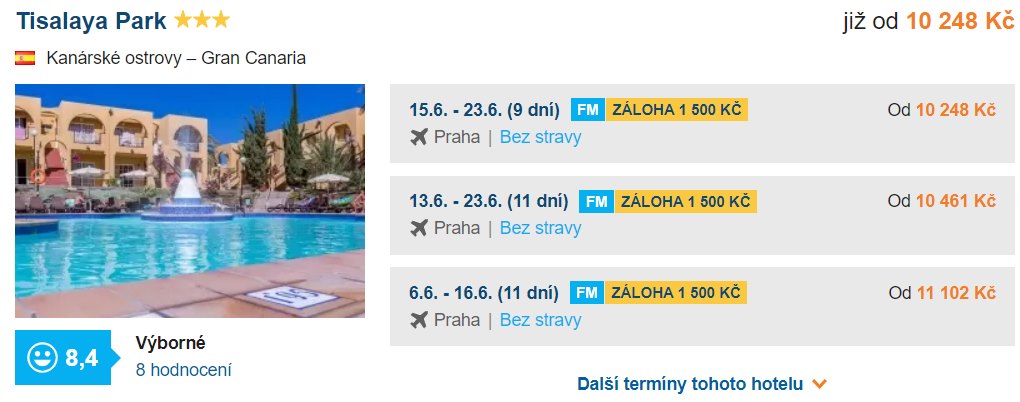 S odletem v červnu je dnešní zájezd do tříhvězdičkového hotelu Tisalaya Park na kanárském ostrově Gran Canaria nejlevnějším pobytem vůbec. Ač je bez stravování, tak jde o velmi zajímavou nabídku. Důvodem je především perfektní hodnocení. Resort si totiž drží průměrnou známku 8,4 z 10 bodů. Zájezd dlouhý 9 dní je skvělý také přímým letem z Prahy.