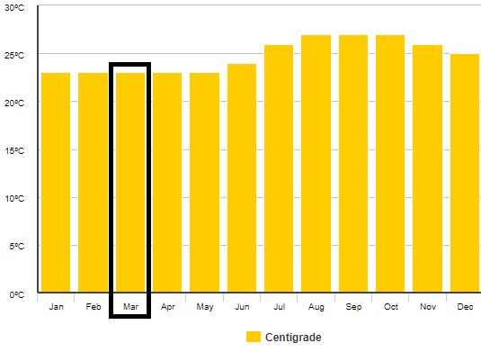Od ledna do května je průměrná teplota vzduchu totožná. Jde o dlouhé období nejnižších teplot v celém roce. Jelikož je ovšem průměrná hodnota teploty vzduchu 23 °C s denními maximy až 25 °C jde i tak o teplotně skvělé měsíce pro koupání i opalování.