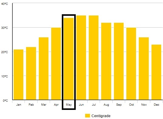 Pocit horka umocňuje i 13 hodin slunečního svitu na obloze prakticky bez mráčku a s minimálními dešťovými srážkami. Teplota vody v moři se pohybuje průměrné lehce pod 30 °C a na mělčině je voda ještě teplejší. nelze tedy spoléhat na ochlazení organismu ve vodě.
