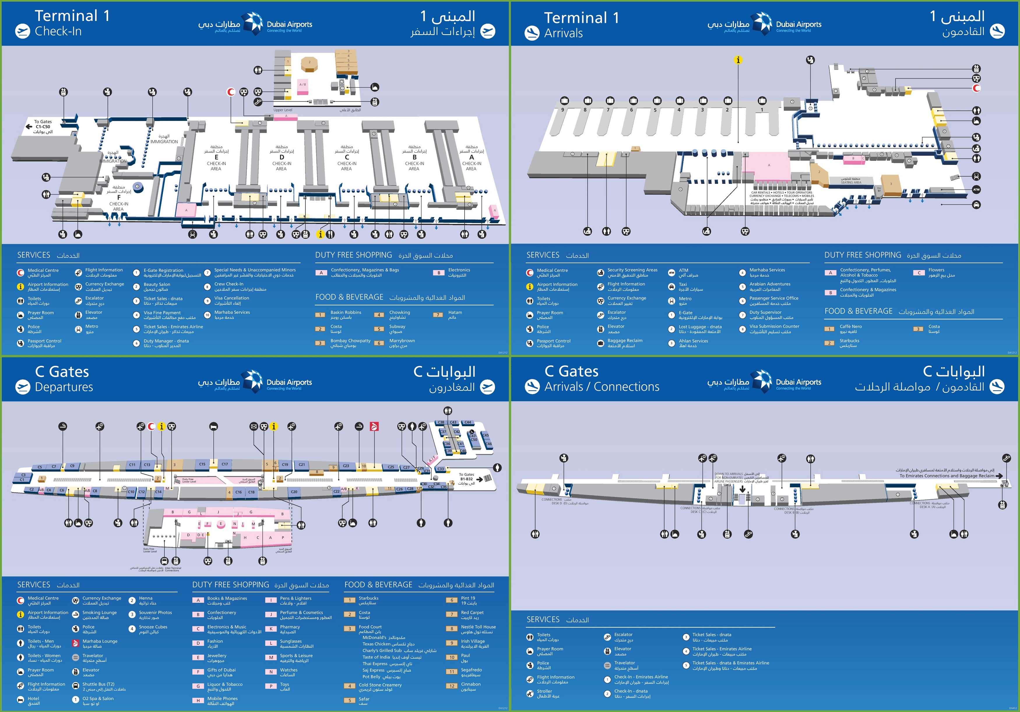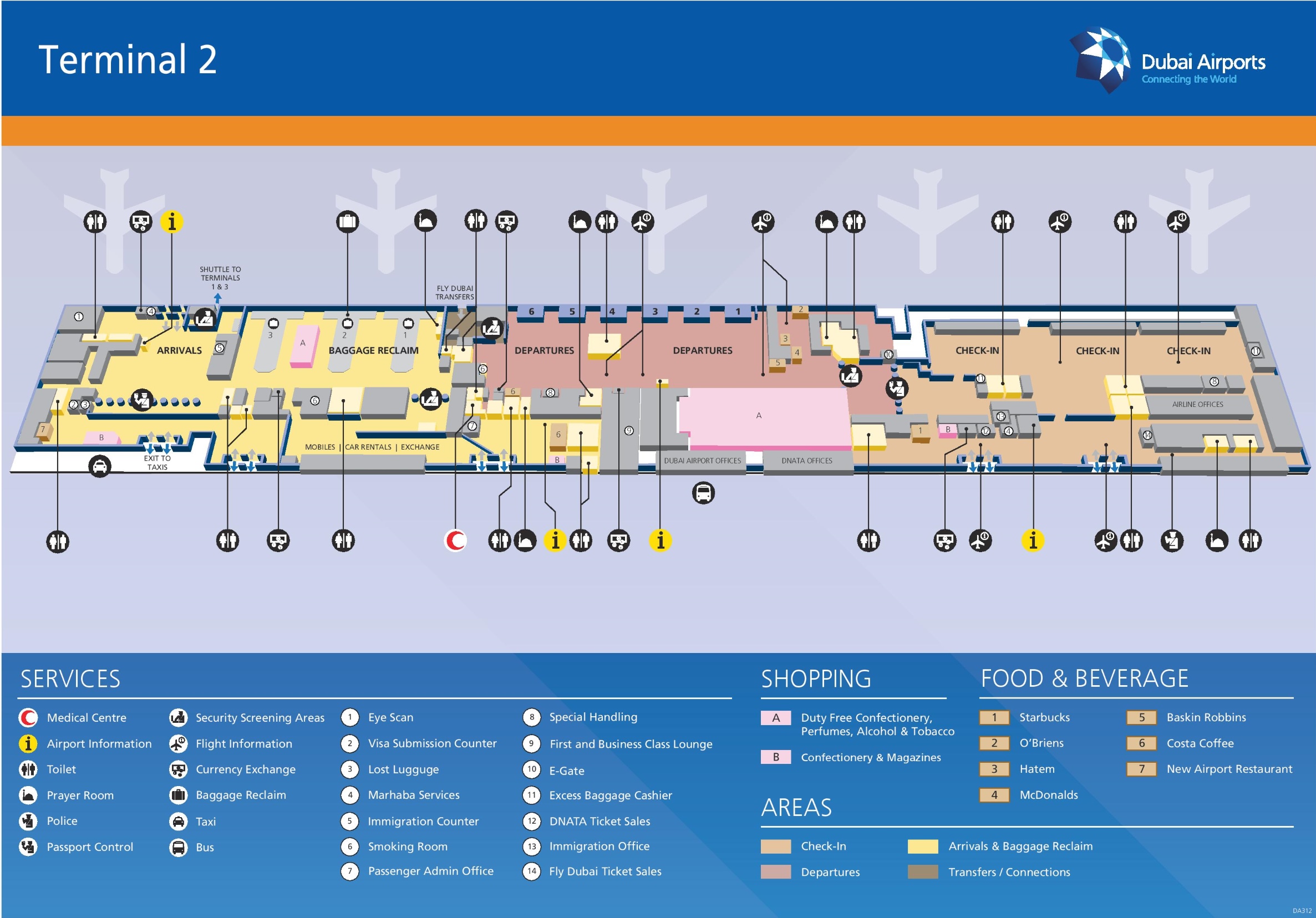 Nízkonákladové společnosti (SmartWings, FlyDubai) mají vyhrazený Terminál 2. Terminál 3 je potom určen pouze pro společnost Emirates. Je zajímavostí, že tento terminál je druhou největší jednopatrovou budovou na celém světě! Terminál 1 je pak určen pro běžné letecké společnosti.