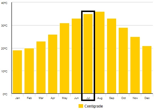 Jedinou možností jak strávit v červenci pěkný čas v Dubaji je být mezi 10 až 17 hodinou zavřený ve vnitřních klimatizovaných prostorách (a dávat si přitom pozor na silné klimatizace) a ven vylézat ráno a večer. Pokud jen trochu můžete zvolte si k návštěvě Dubaje jiný měsíc než červenec.