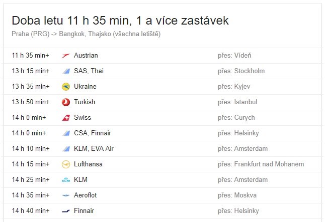 Skutečná vzdušná vzdálenost není 8.560 km, let se prodlouží o jedno z mnoha mezipřistání. Na letech do Thajska můžete využít nejrychlejší Austrian. Ten operuje let z Prahy s mezipřistáním ve Vídni.