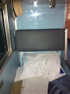 Mé lehátko ve vlaku při cestě z nádraží v Bangkoku